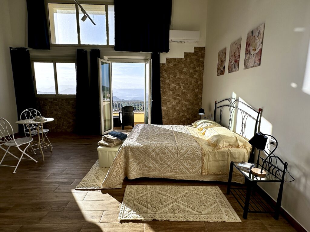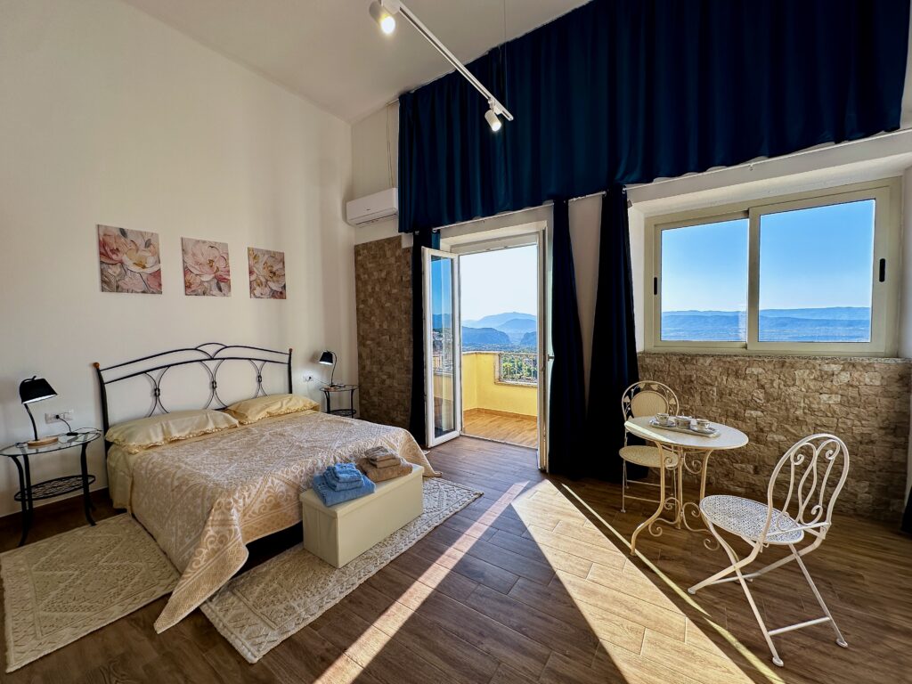 Il vero gioiello della camera è il balcone accessibile, raggiungibile senza barriere, da cui lo sguardo spazia sul paese e sulle montagne circostanti in un panorama che cambia con la luce del giorno.